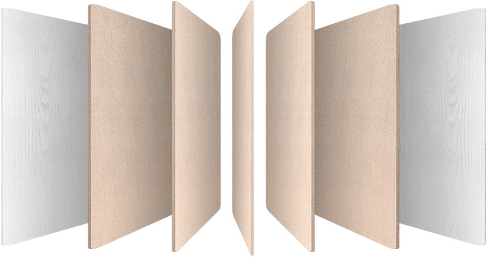 将芯材旋切成单片薄板,按照整板整芯、科学组坏平面分布,奇数多层、纵横交错立体结构胶合而成兼具健康环保与稳定性能,握钉力、抗变形能力尤佳